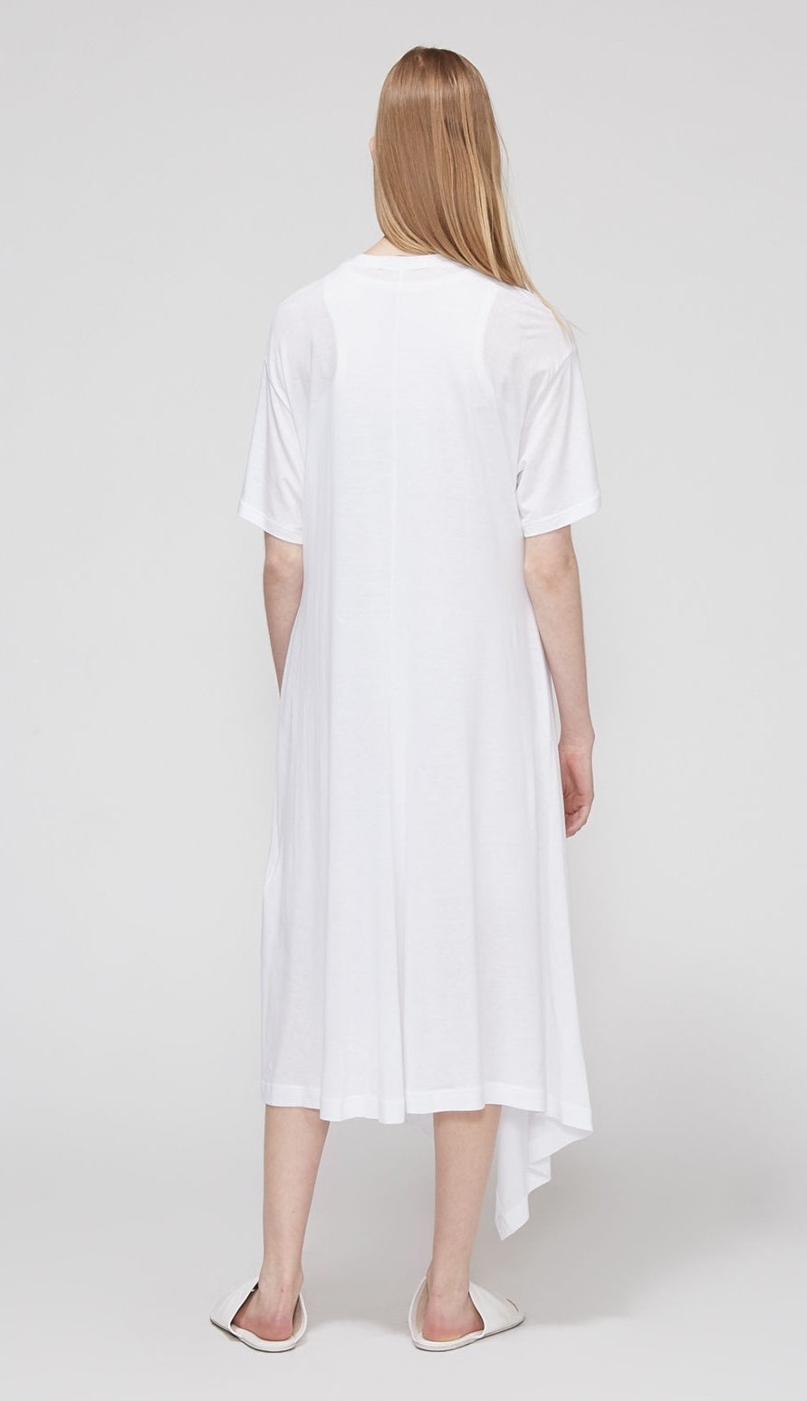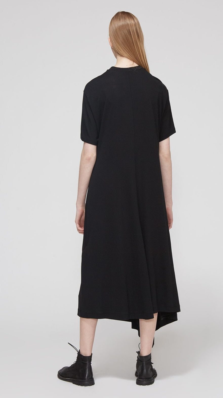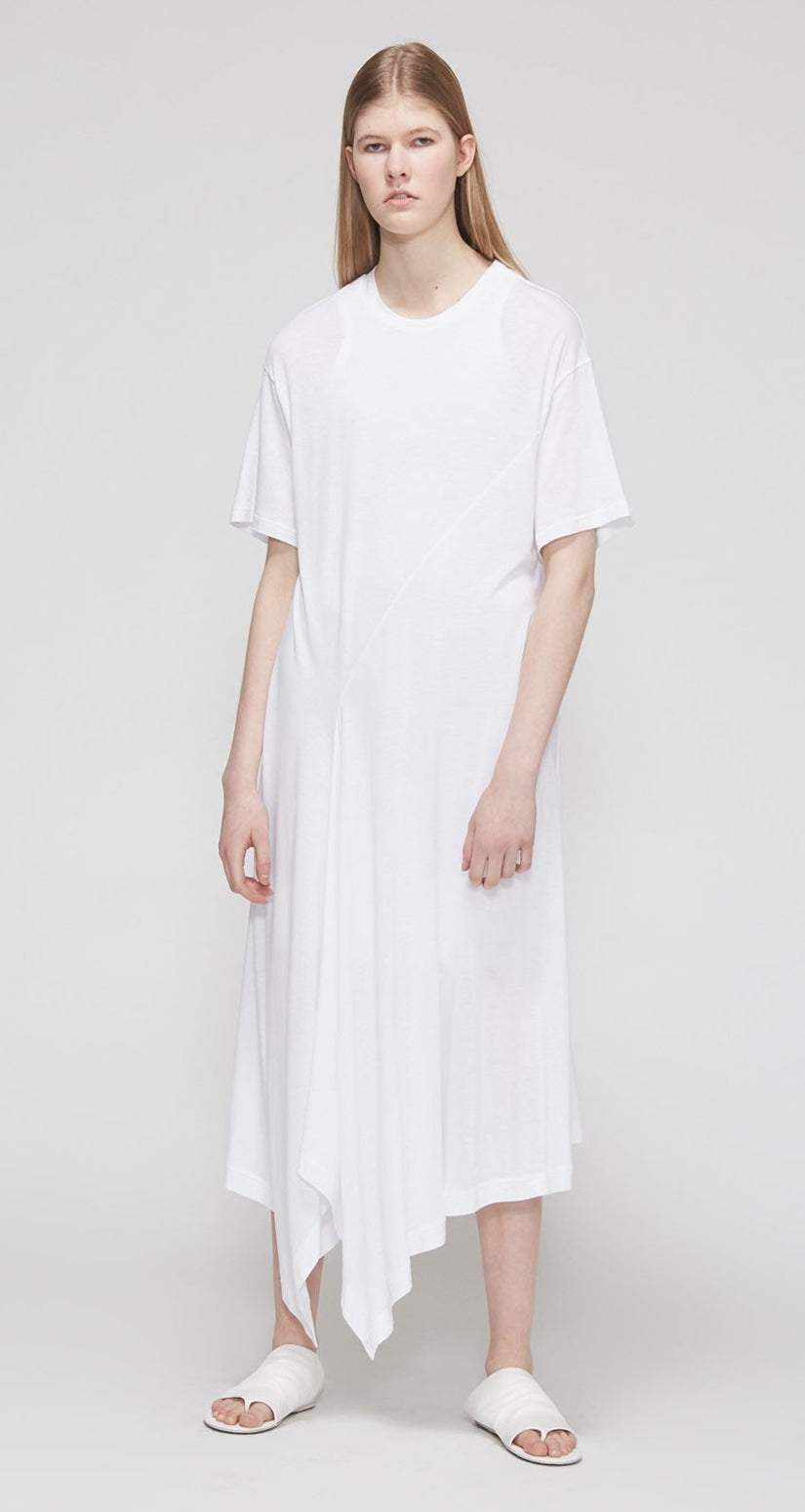 Short-sleeved shirtdress in soft jersey with asymmetric skirt. Dropped shoulders. Dry clean.