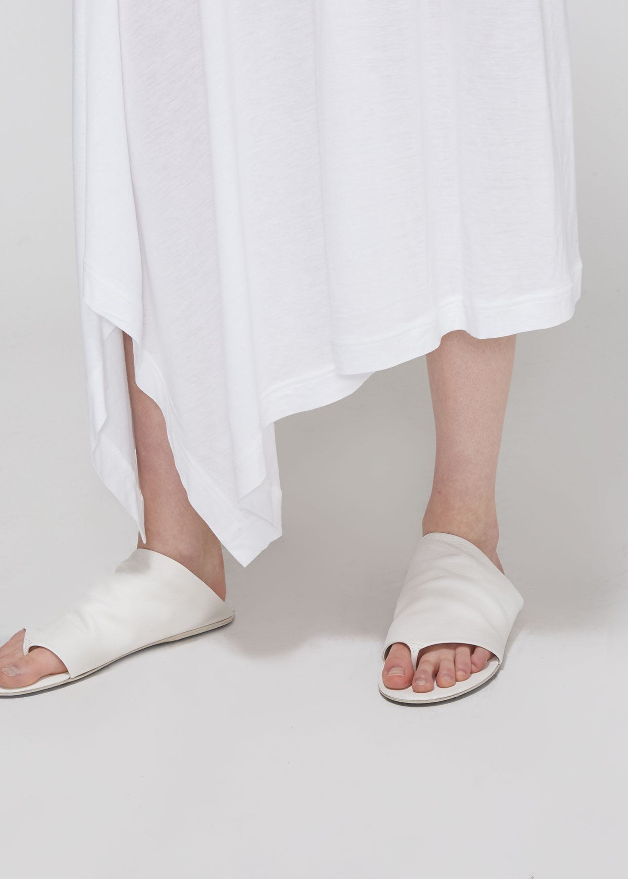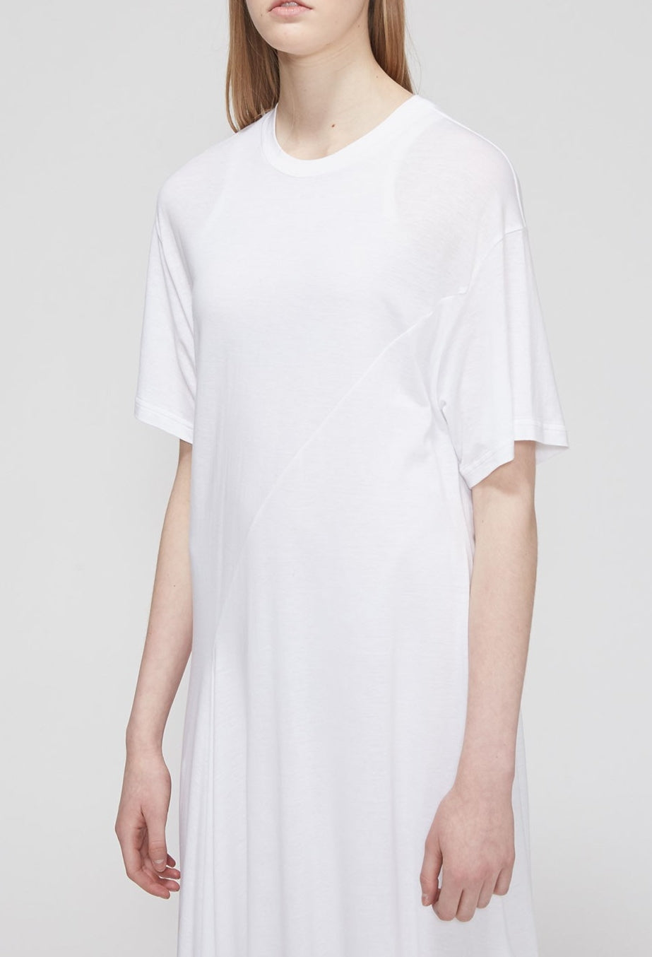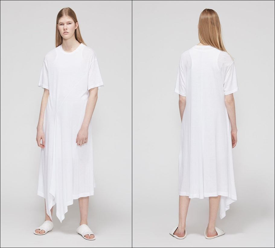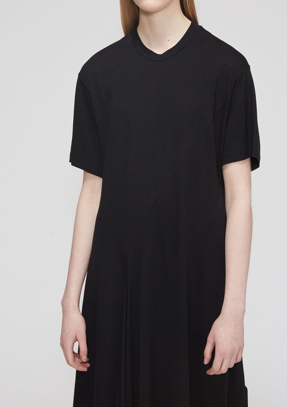 Short-sleeved shirtdress in soft jersey with asymmetric skirt. Dropped shoulders. Dry clean.