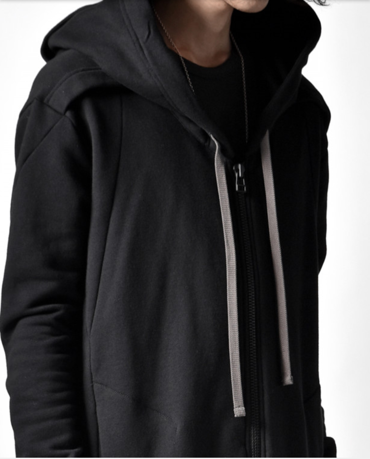 Exposed silver-tone front zip closure, integrated drawstring hood with long contrasting off-white drawstrings, long sleeves with ribbed cuffs.