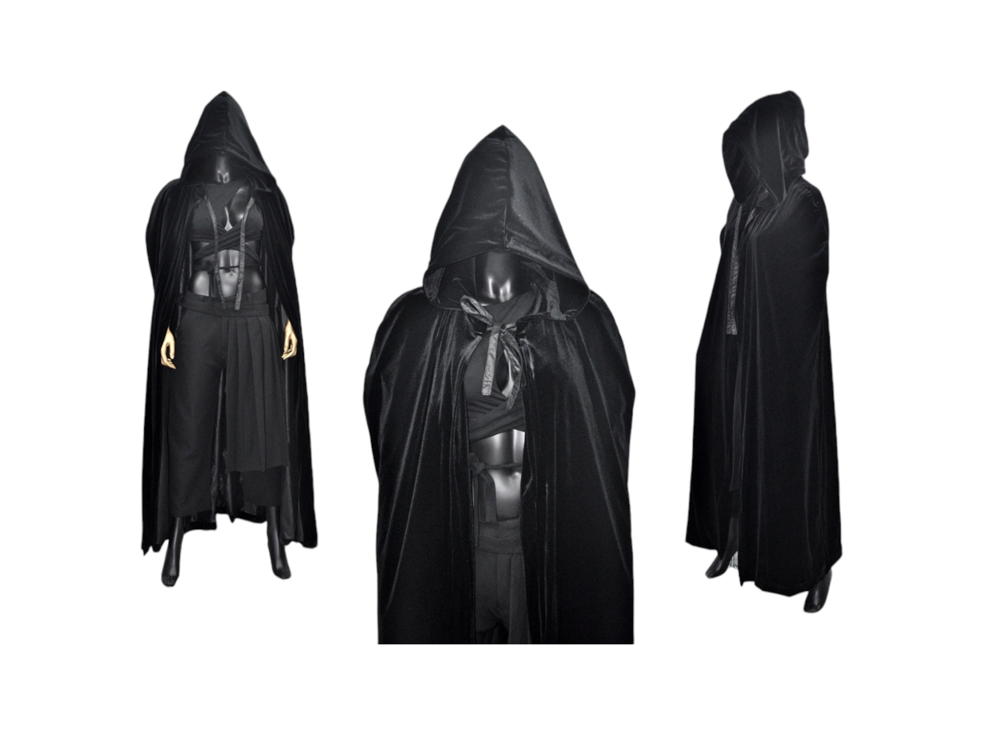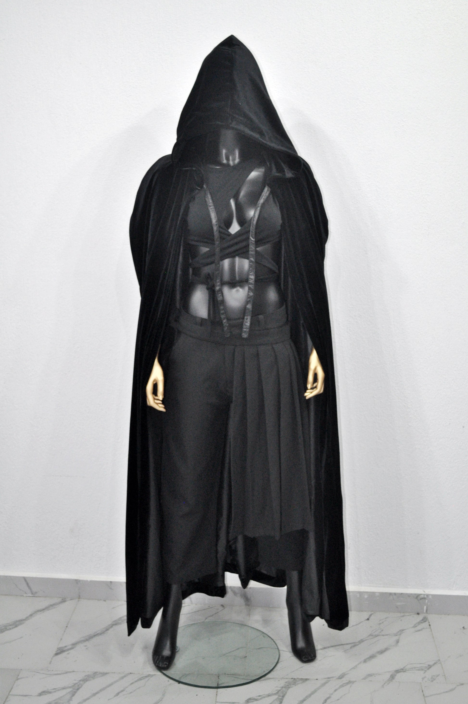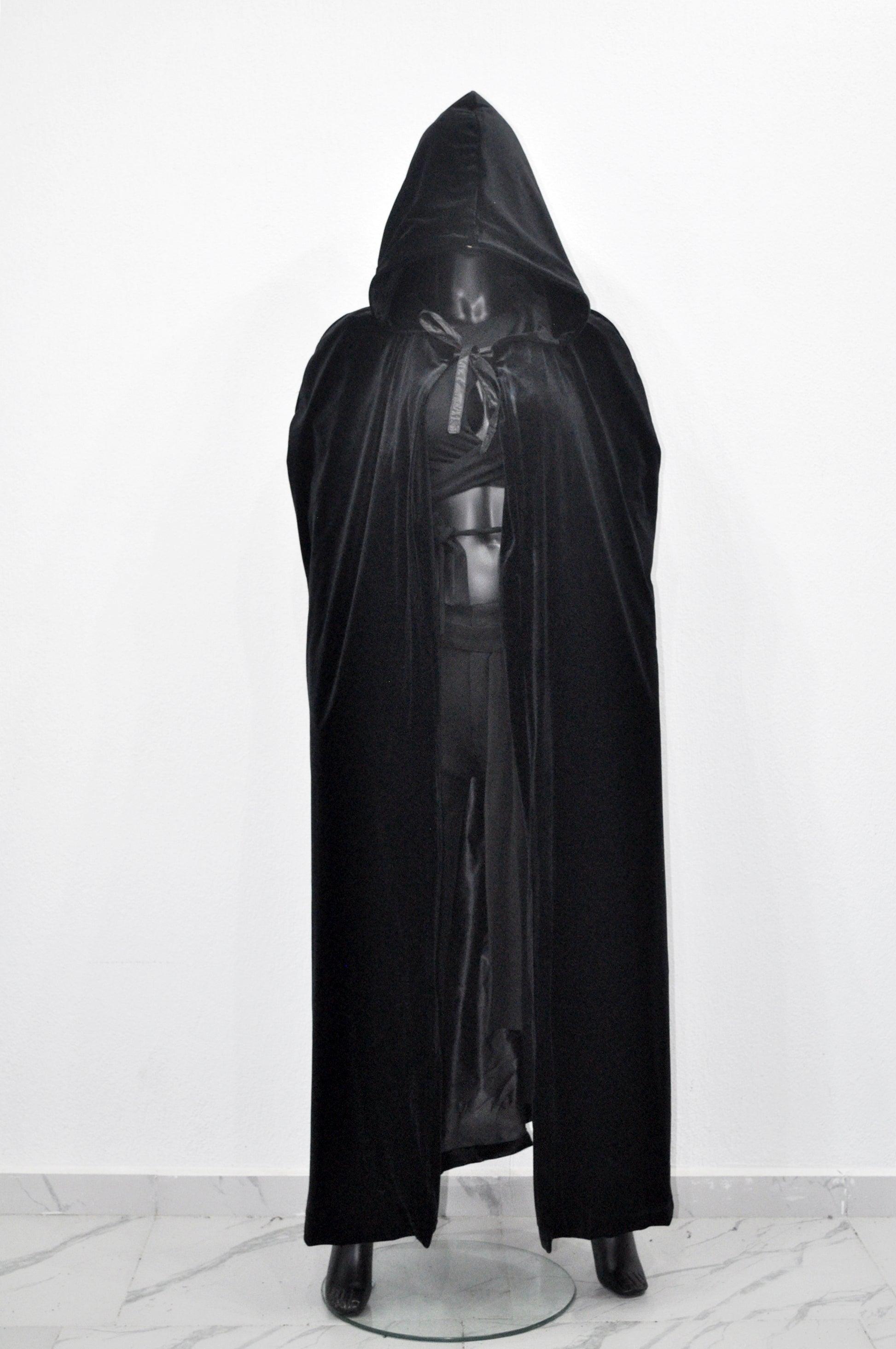 will have you trespassing on cemetery grounds. This cape has a velvet construction, a fixed hood, and satin ties.