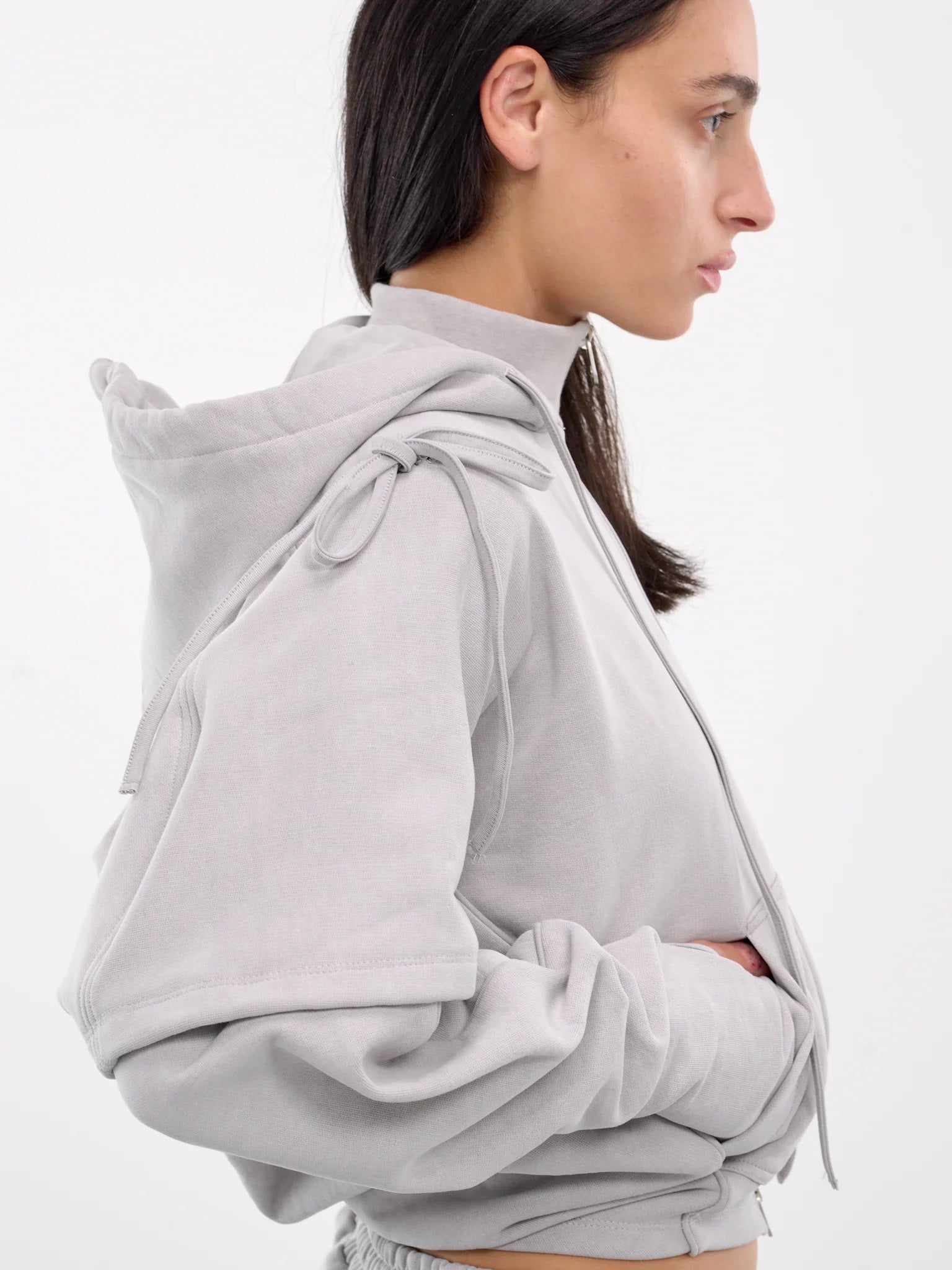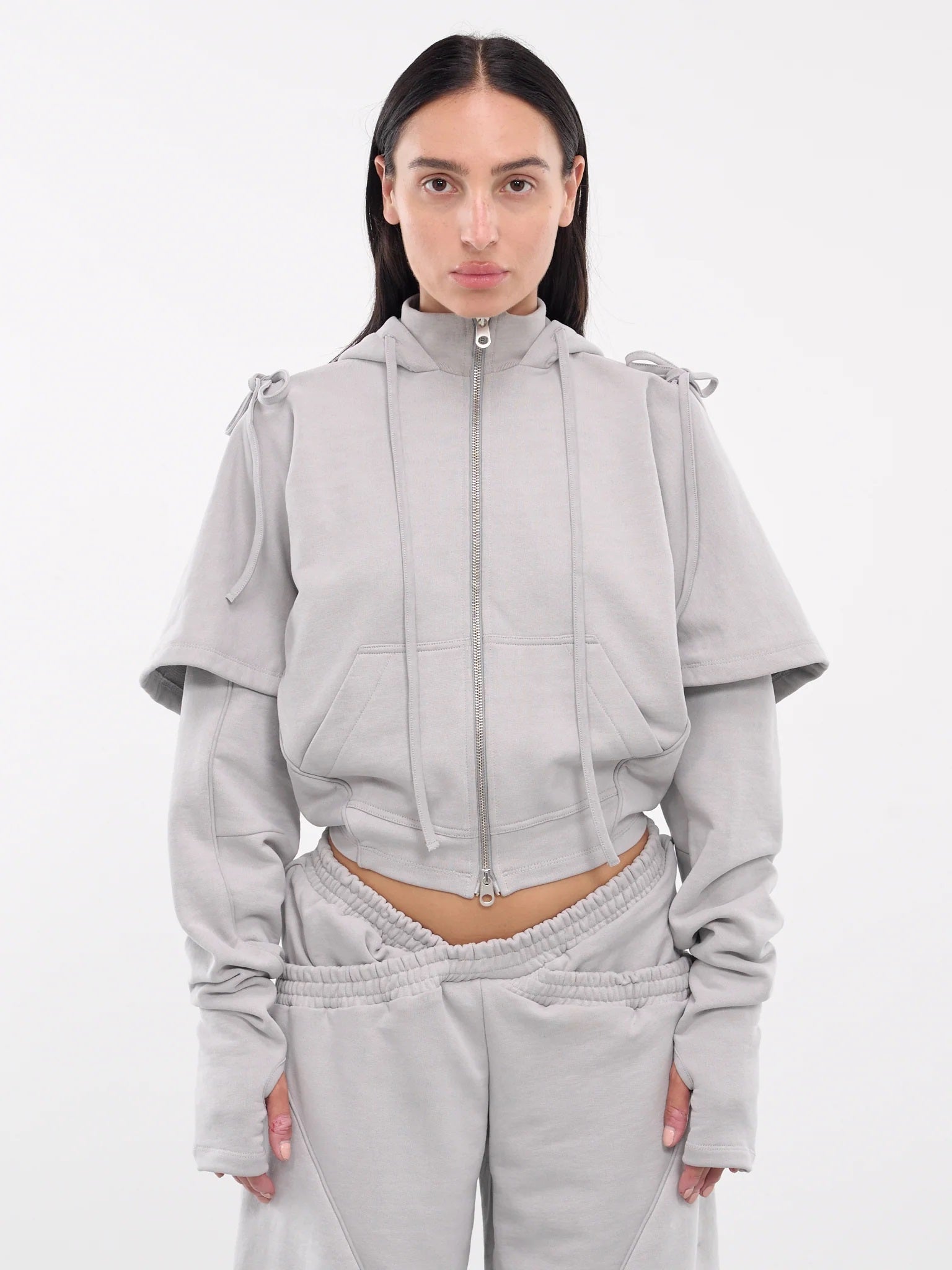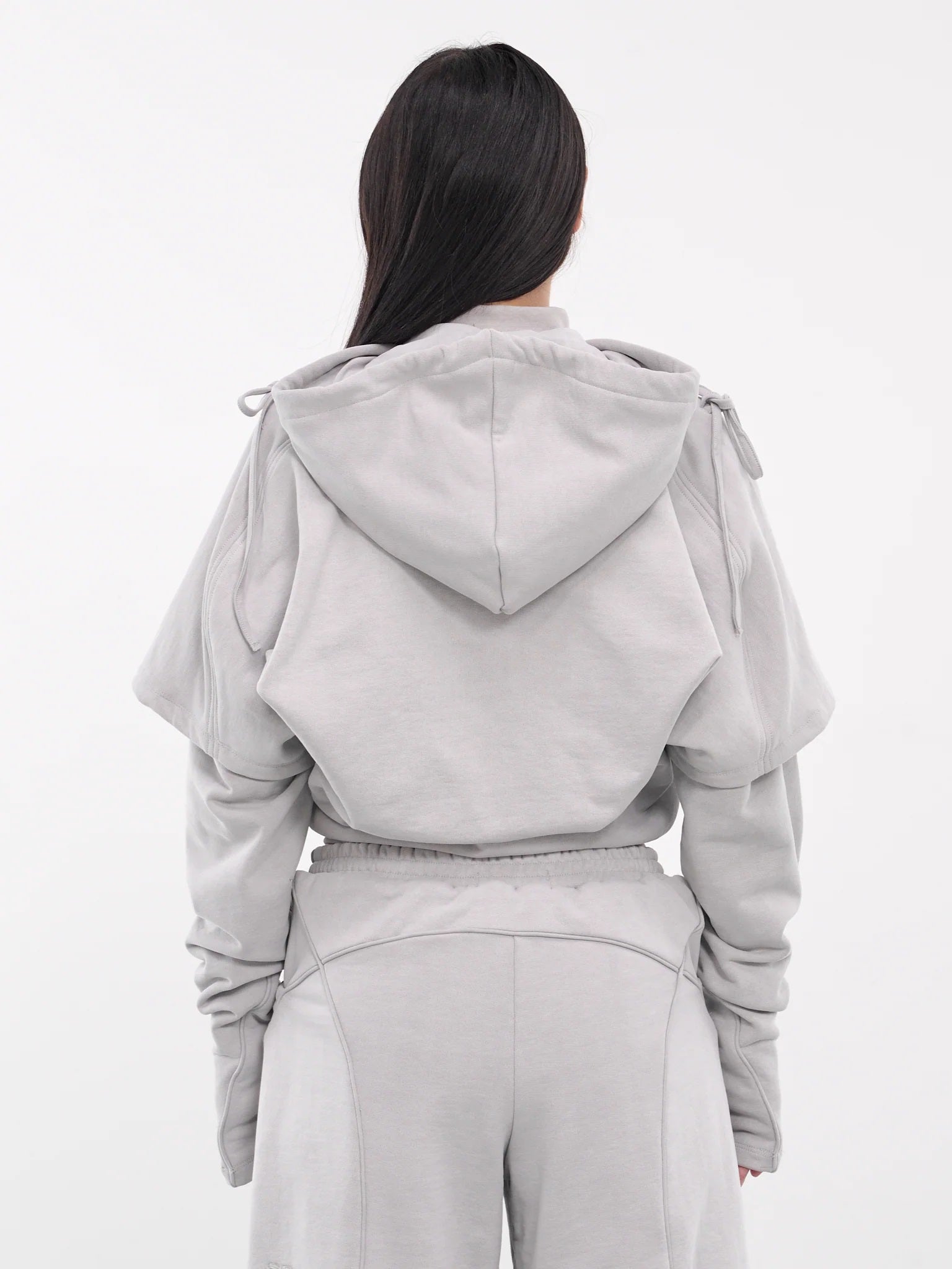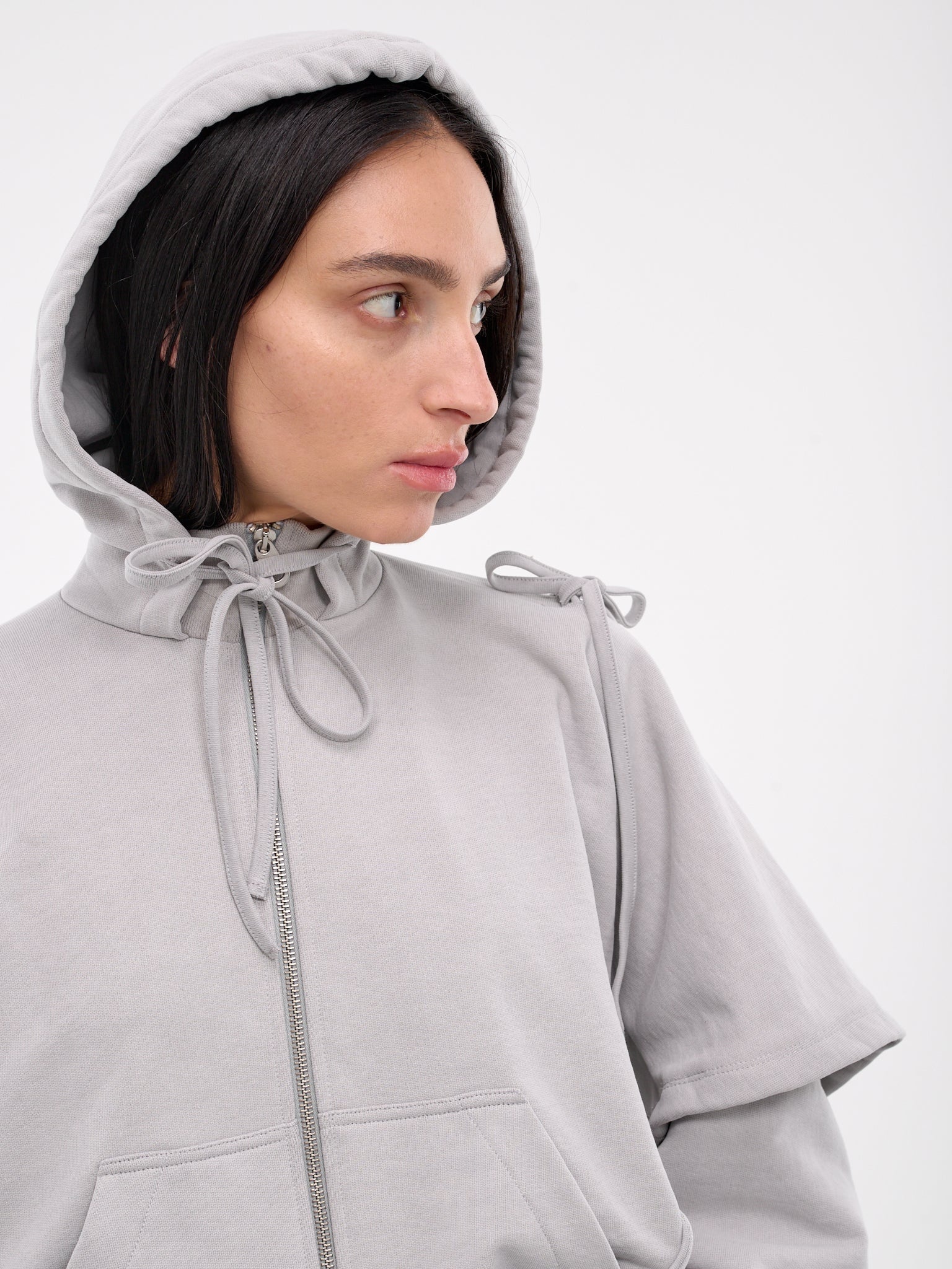 Hoodie in grey, layered design, paneled cotton construction, high neck, hood, adjustable drawstring, shoulder self-ties, front exposed one-way zip closure, layered short & elongated sleeves, thumbholes, front kangaroo-style pockets, straight hem, relaxed fit.