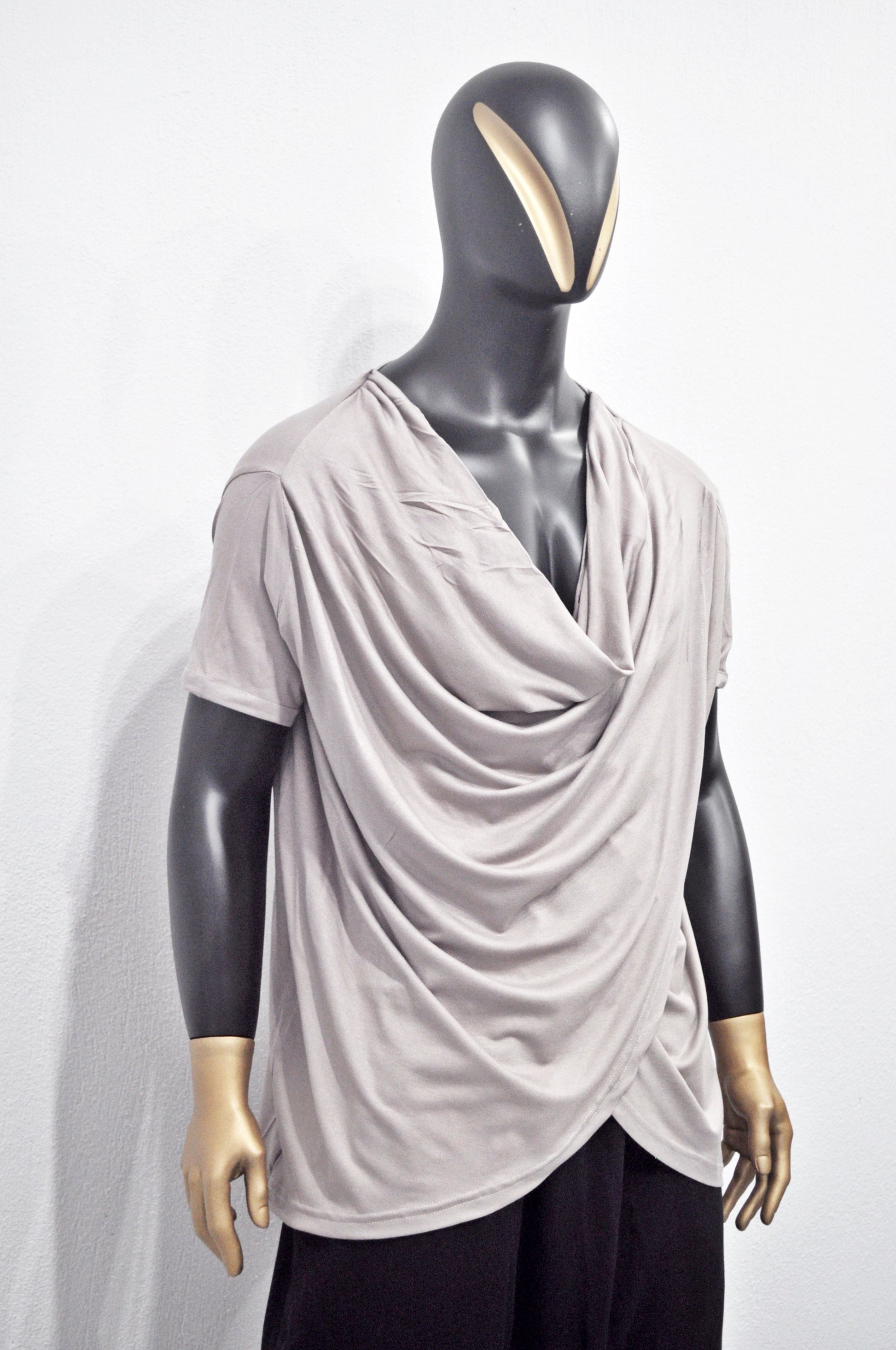 Men’s Draped Cowl Neck Shirt – Avant-Garde Asymmetrical Short Sleeve Top, Minimalist Streetwear, Soft Gray Modal Blend, Misgendered -BB515