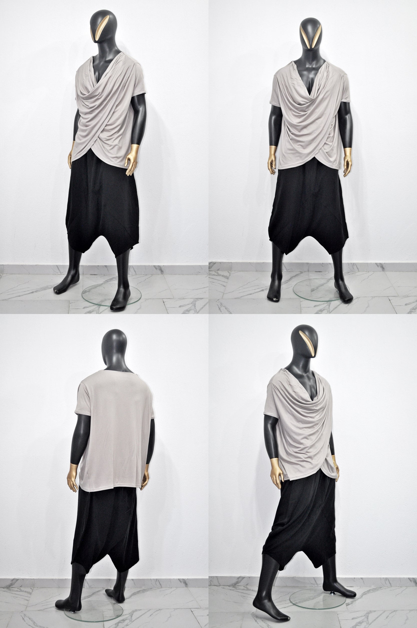 Elevate your wardrobe with this striking men’s draped cowl neck shirt, designed for the fashion-forward individual. Crafted from a luxuriously soft gray modal blend, this avant-garde short sleeve top features an asymmetrical, layered drape that creates a bold yet elegant silhouette. Ideal for streetwear, art-inspired fashion, or statement minimalist looks, the lightweight fabric offers both comfort and style.