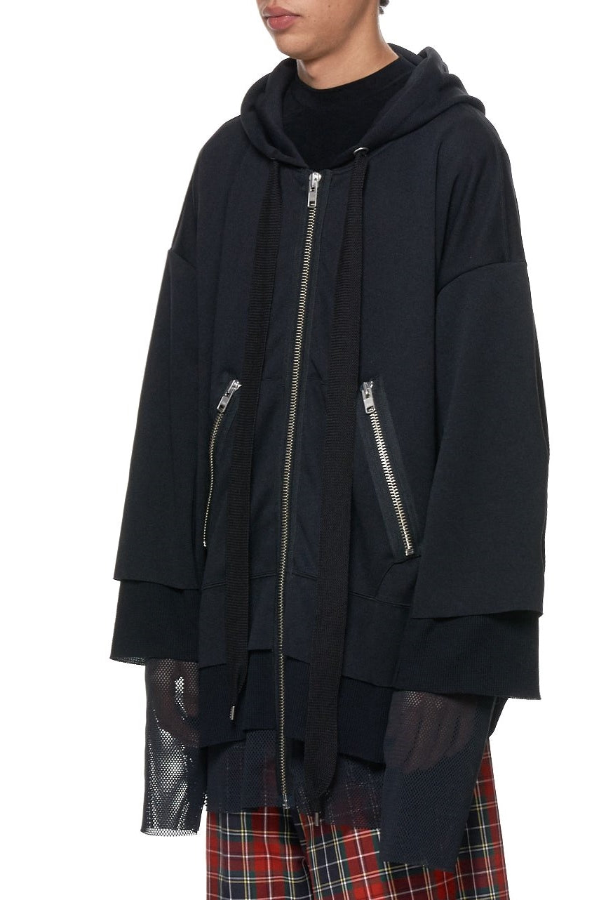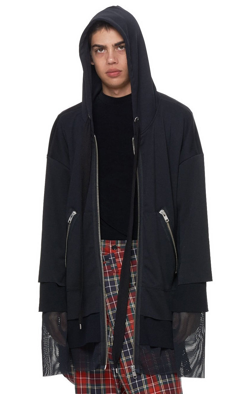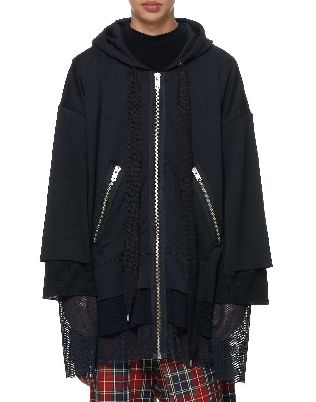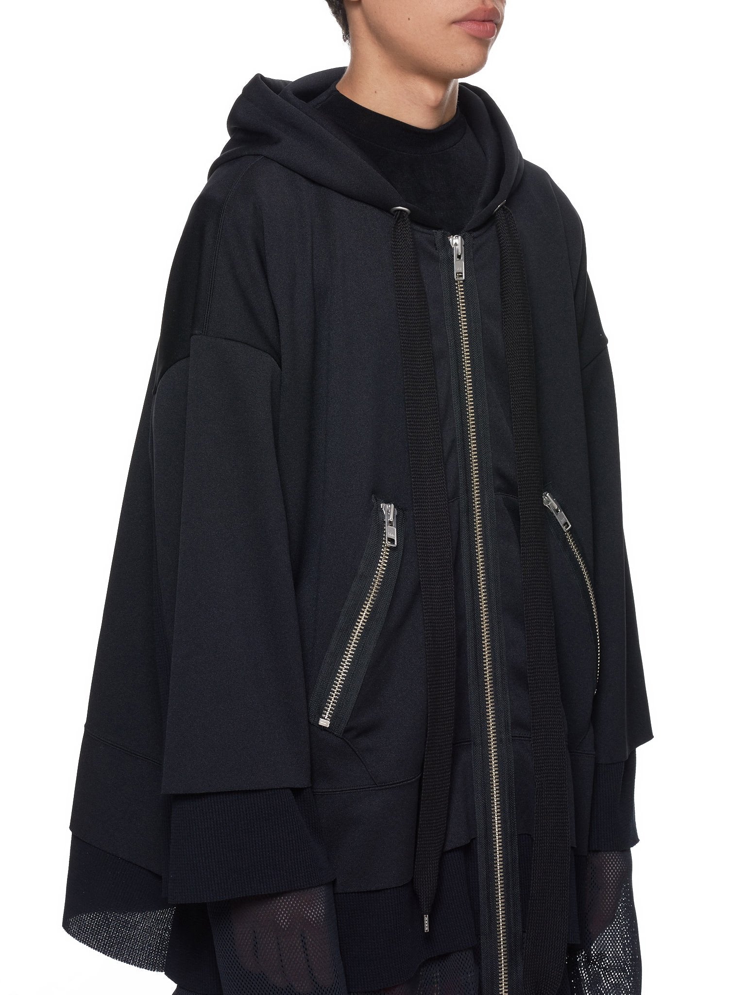 Sweater in black, adjustable hood with chunky drawstring, front zipper closure with silver hardware, hand pockets with zipper closure, polyester layer over mesh layer, triple hem and cuffs, straight hem, tonal stitching.