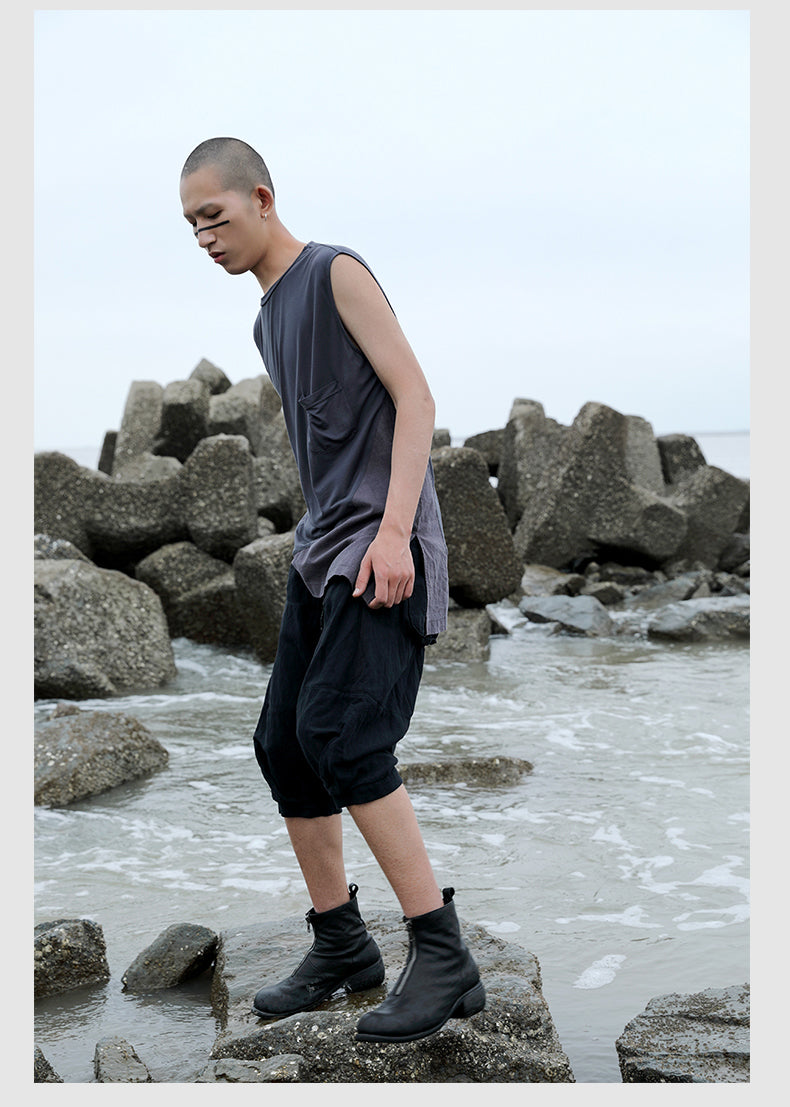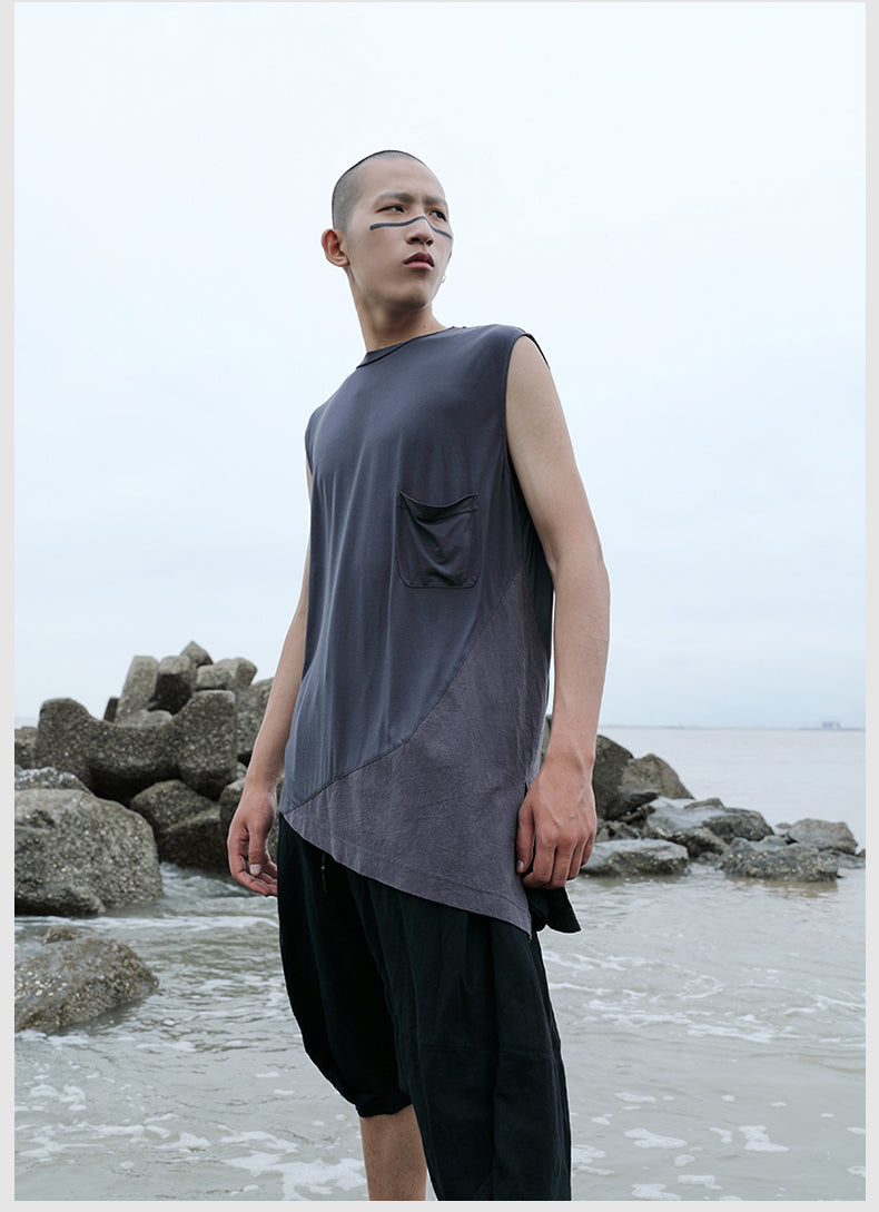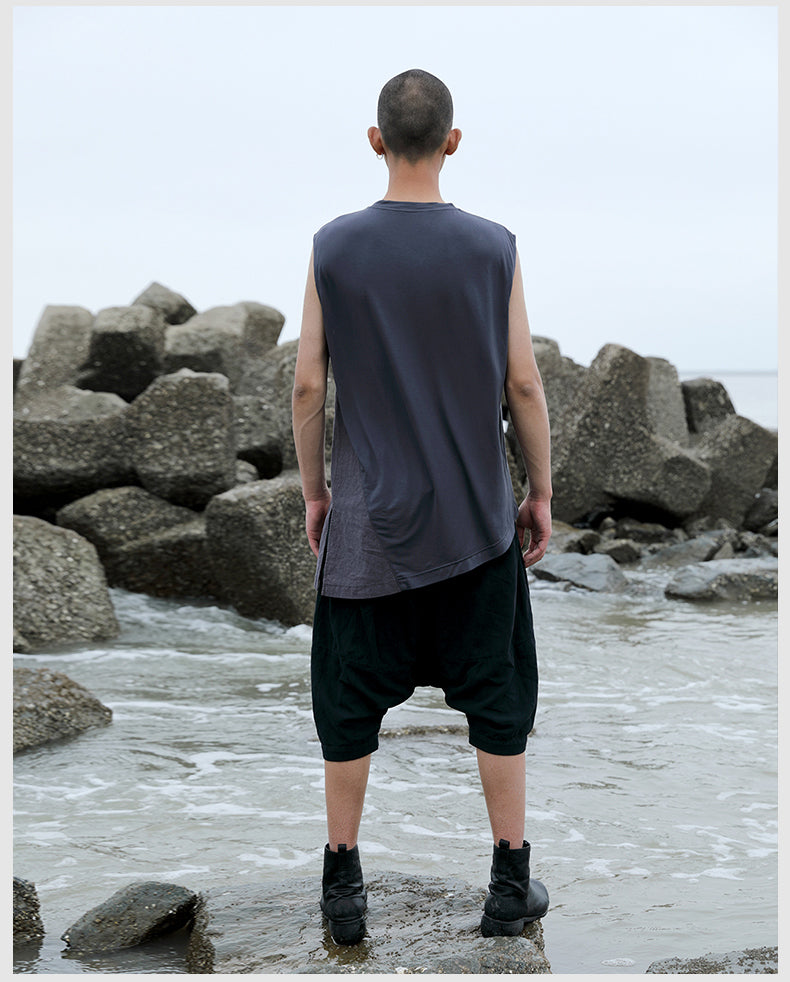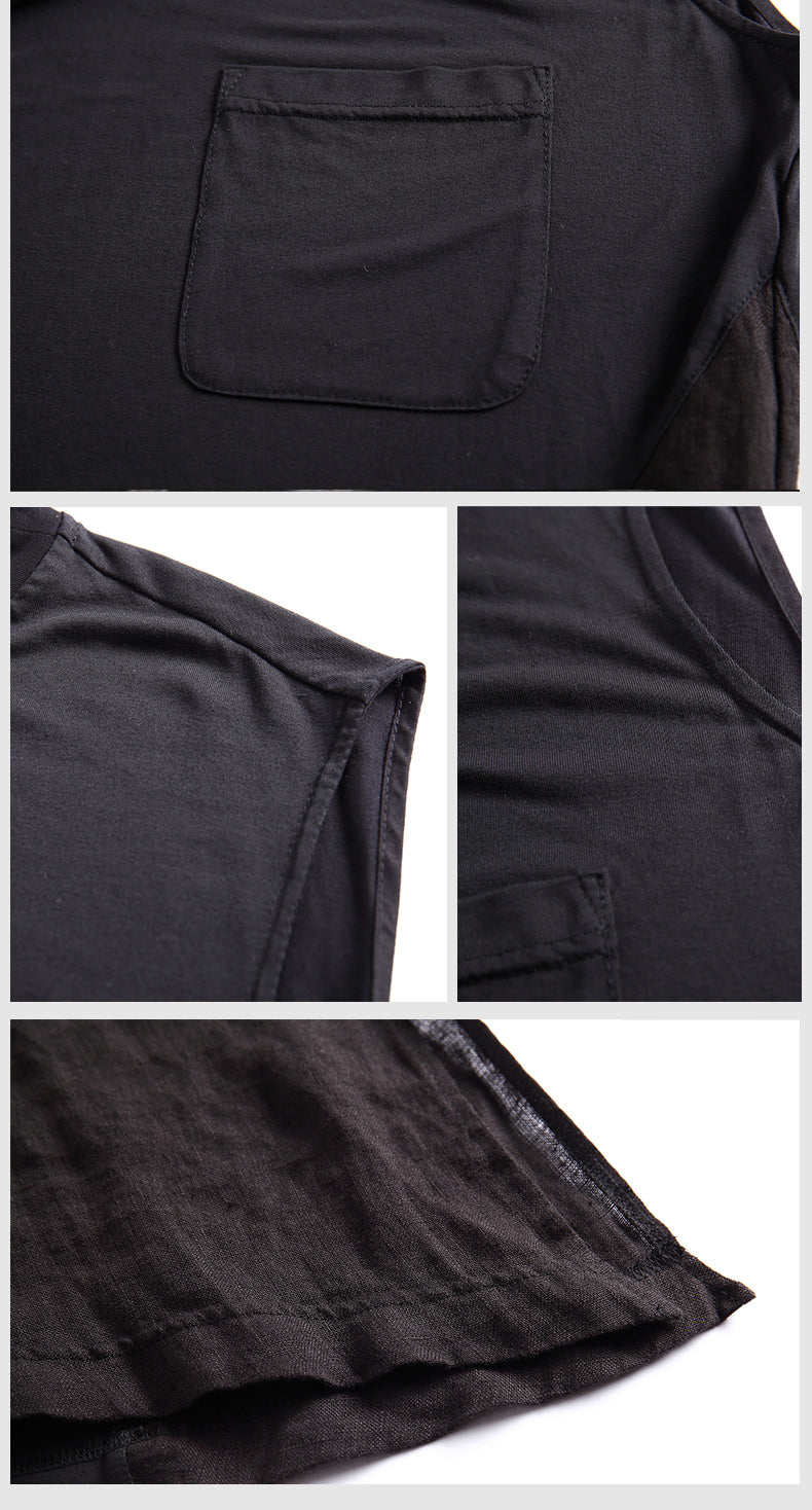 Original Design Men's Summer Stitching Cotton and Linen Sleeveless T-shirt Top Loose Shoulder Vest
