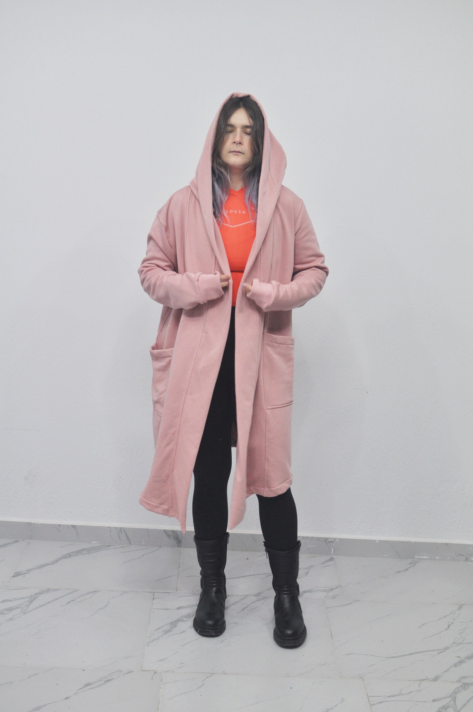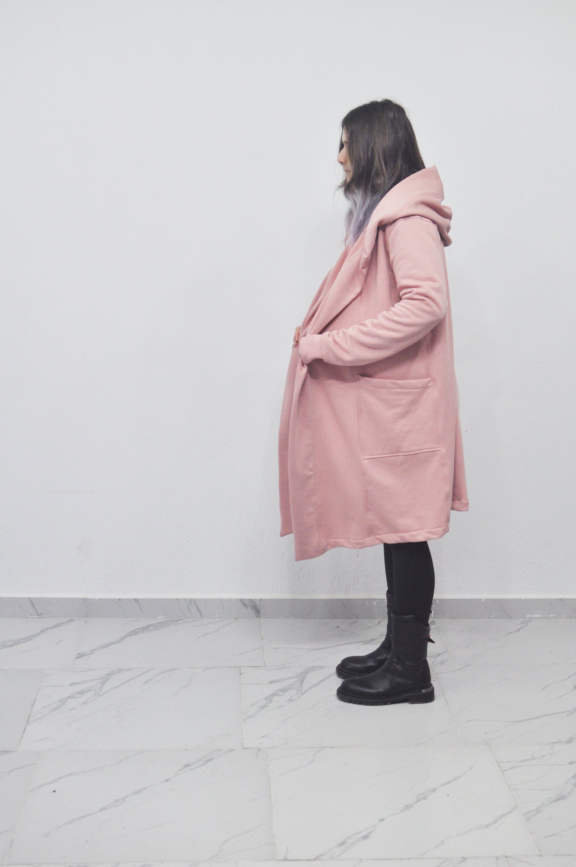 - Hooded coat has elongated beveled edges.