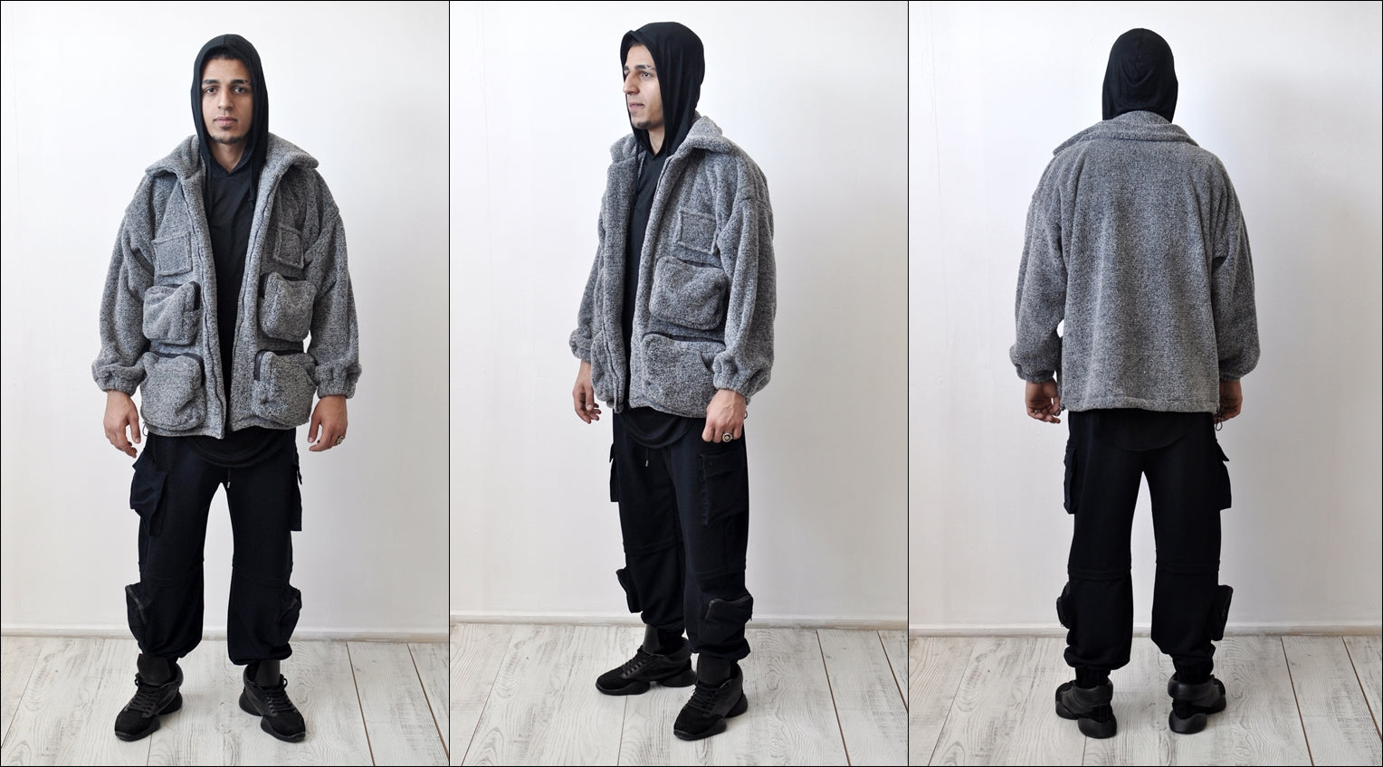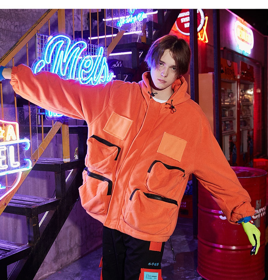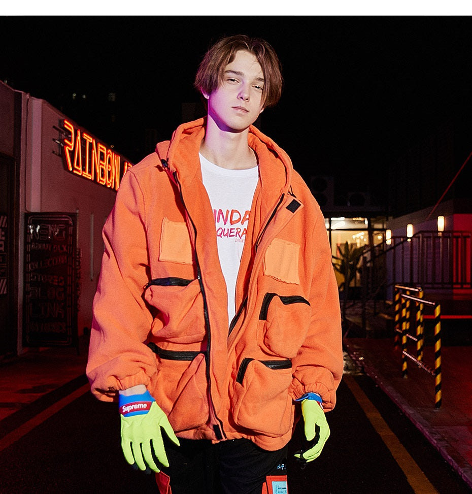 Patchwork Hooded Jackets Men Hip Hop Multi Pockets Warm Coats