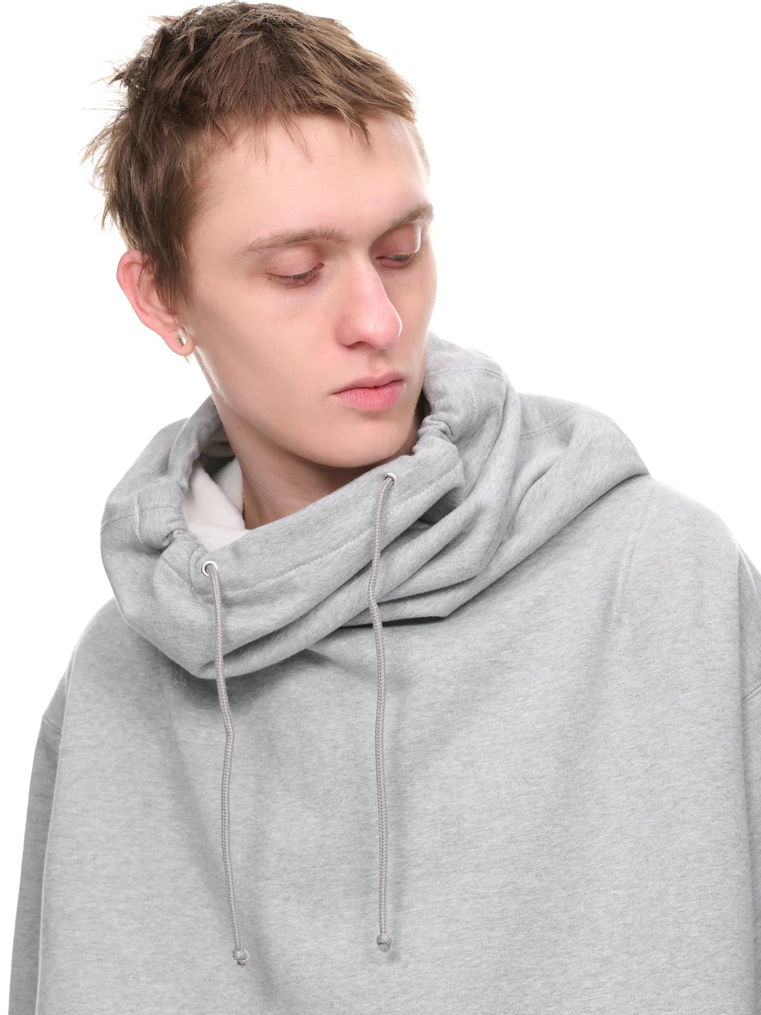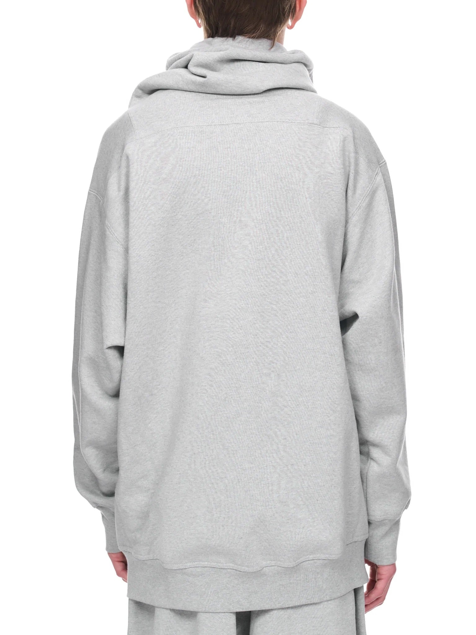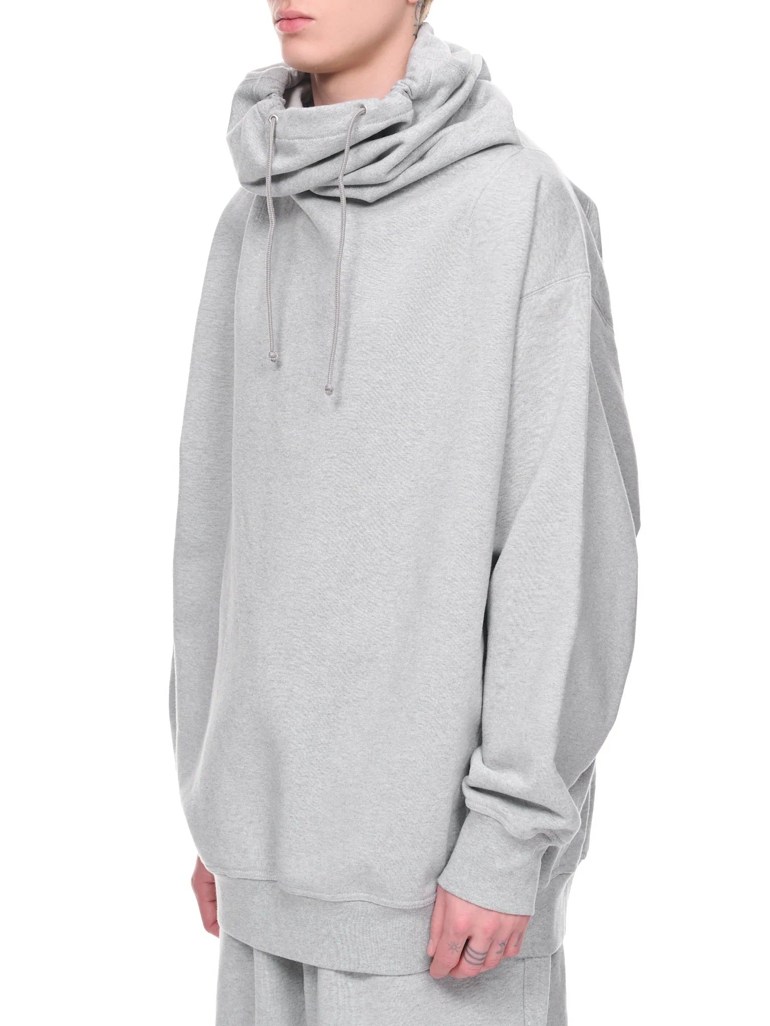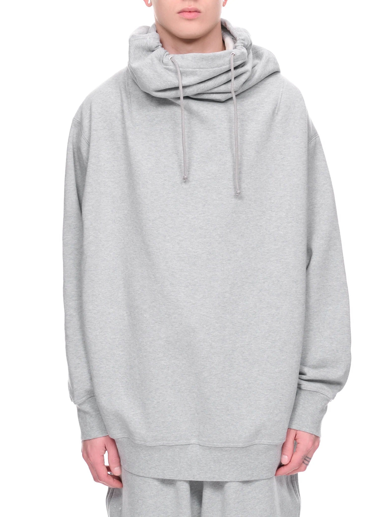 Oversized silhouette, gathered & hooded collar, adjustable drawstring, dropped shoulder, elongated sleeves, ribbed cuffs & hem, relaxed fit
