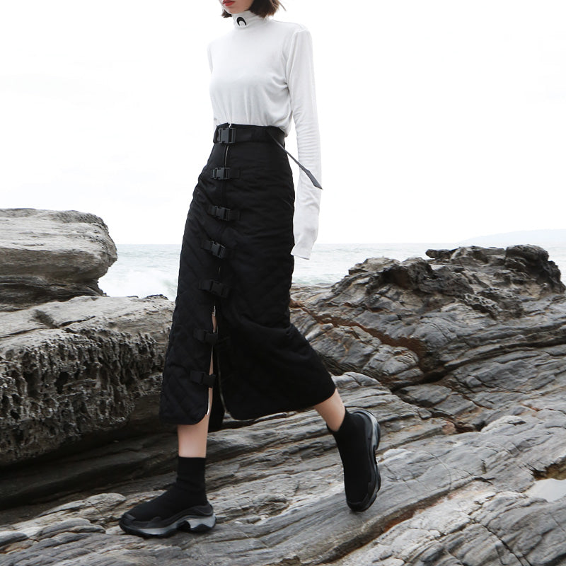 Strap Buckle Decoration High Waist Straight Knee Skirt
