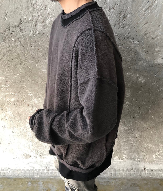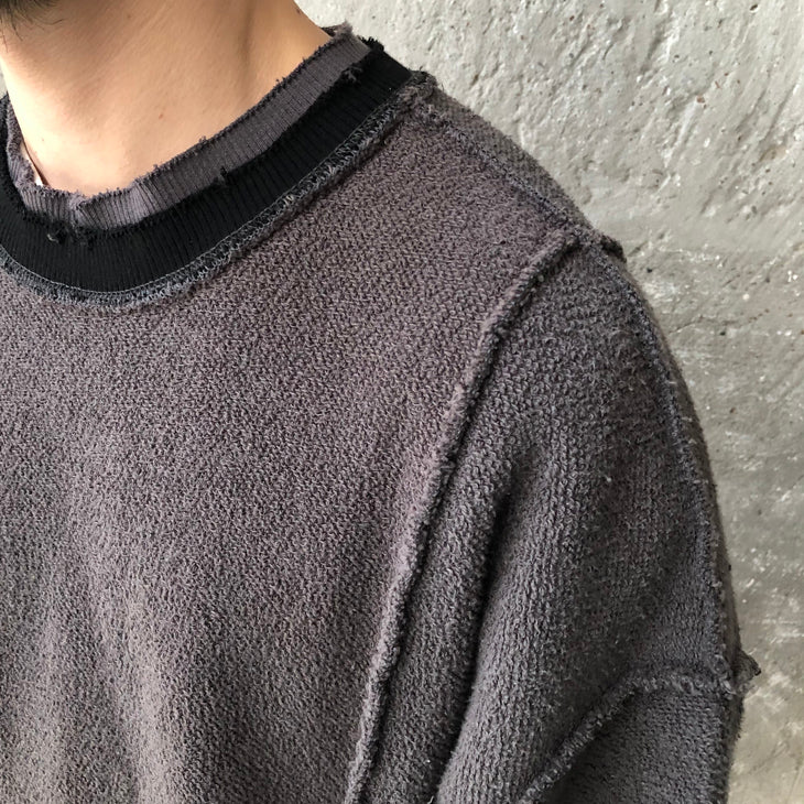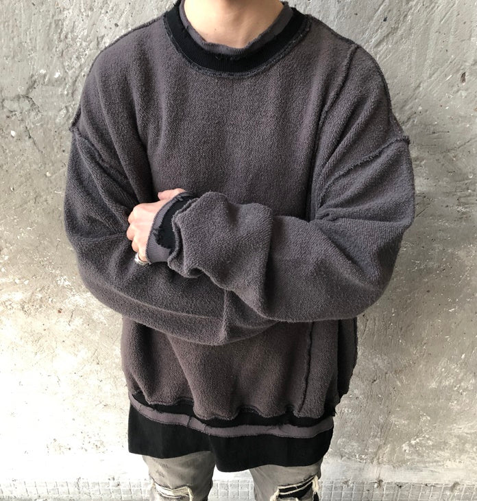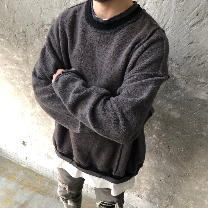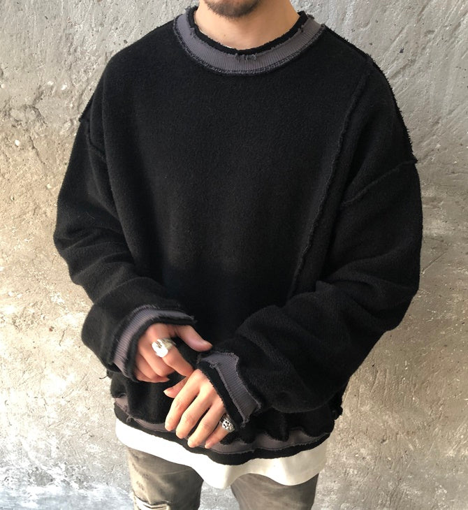 Oversize Positive and Negative Cross Stitching Raw Edge Round Neck Oversized Pullover Tech Sweater