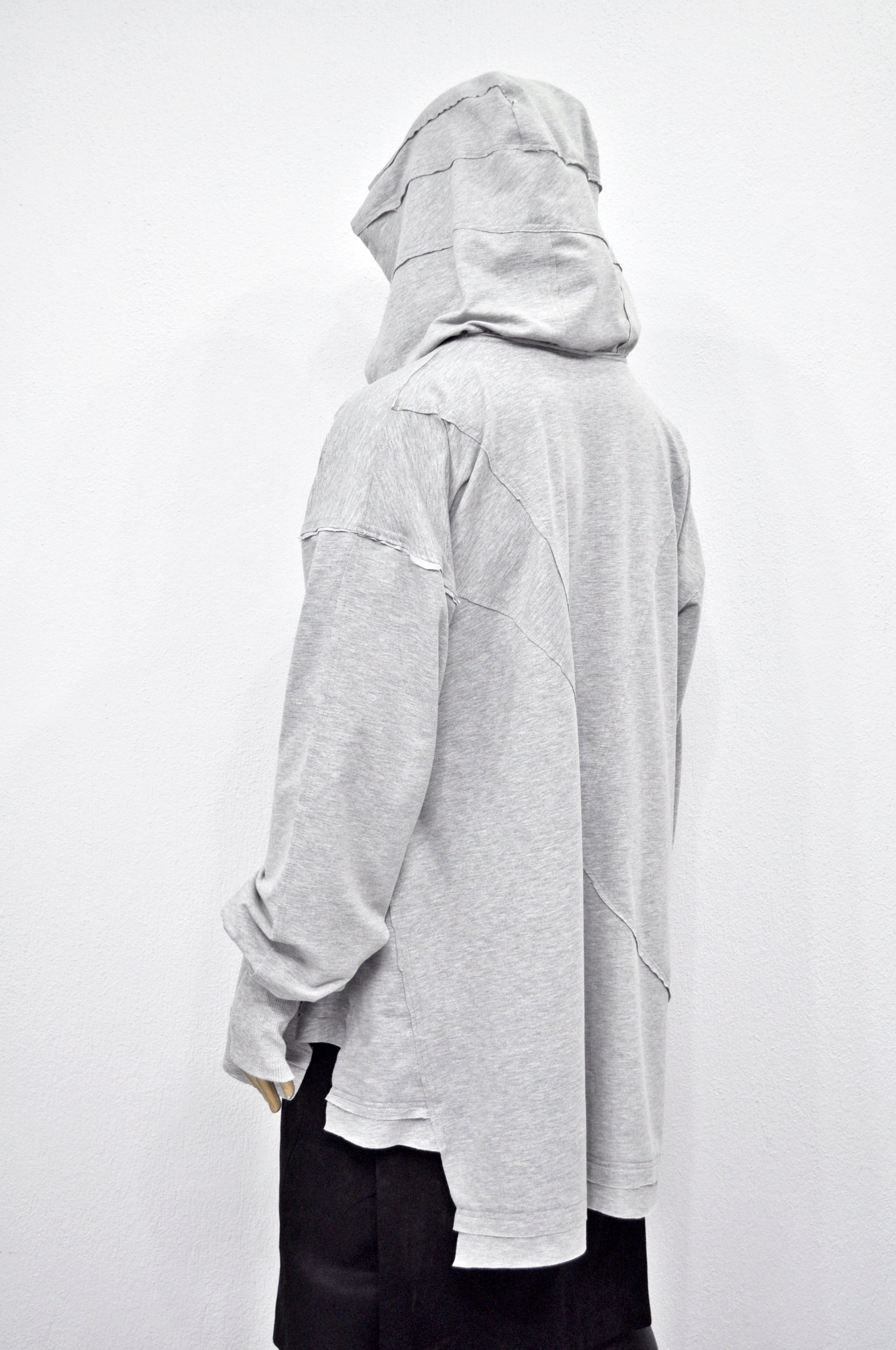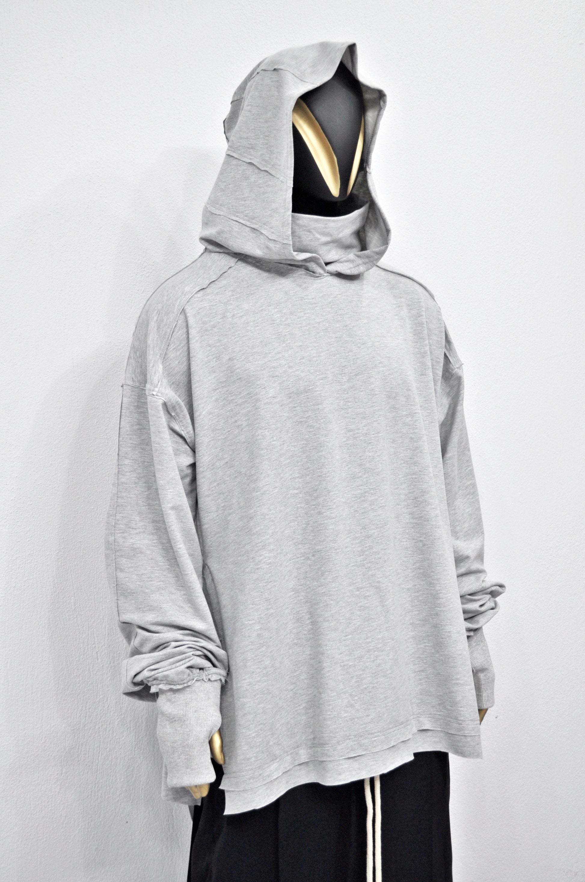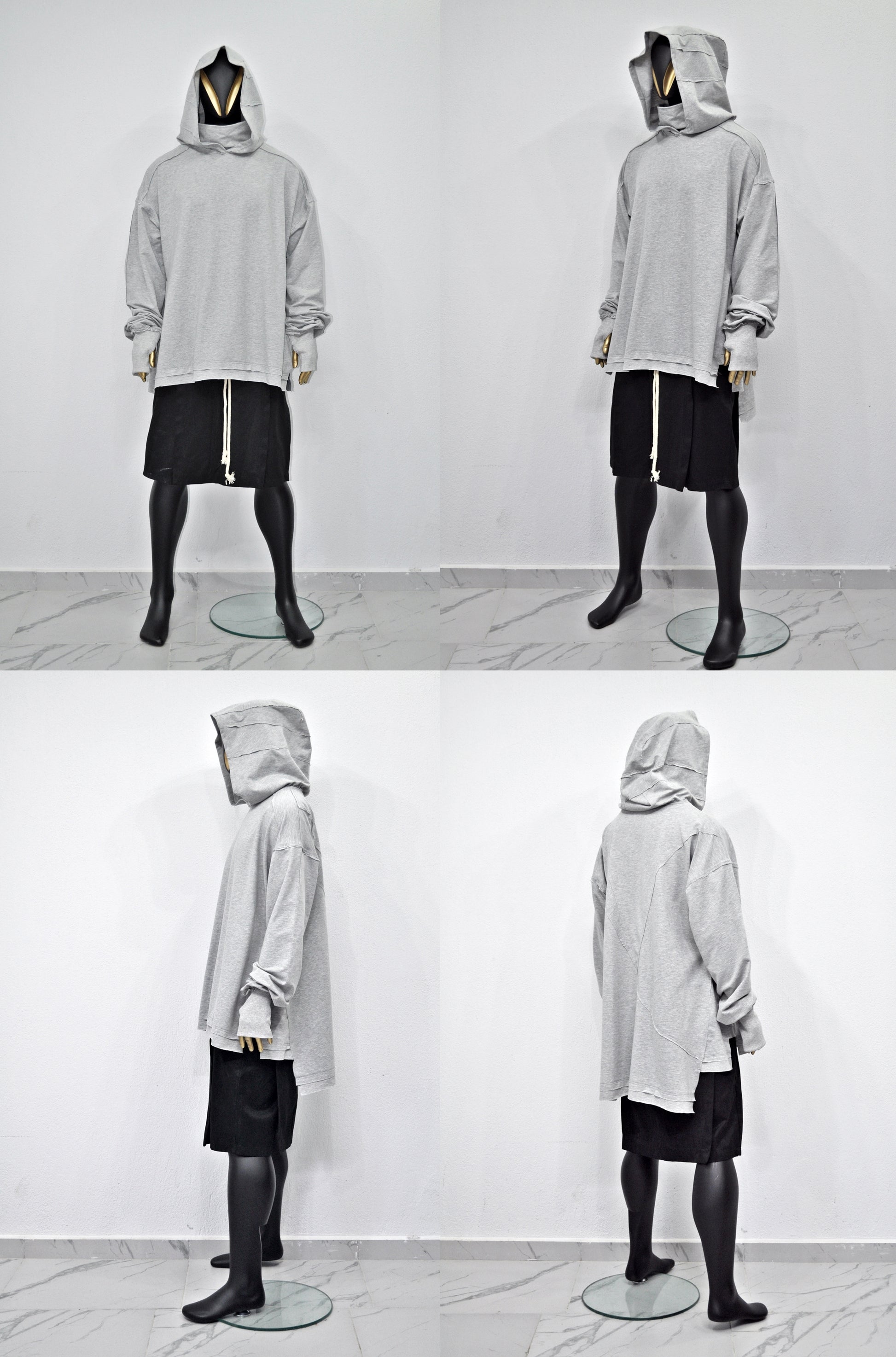 XS-8XL Men's Distressed Structured Silhouette Hooded Turtleneck Sweatshirt,Ashassin Hood Asymetrical Goth Cardigan, Cyber Long SteamPunk Cosplay, Kimono Futuristic- Post Apocalyptic Dystopian